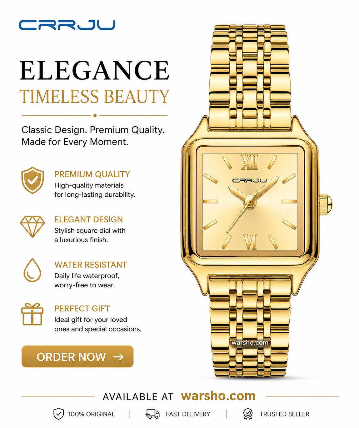 Elevate your everyday style with the CRRJU Women’s Gold-Tone Rectangular Quartz Watch, designed with a timeless retro-inspired look. Featuring a sleek rectangular case and a polished stainless steel band, this watch adds a touch of elegance and sophistication to any outfit.