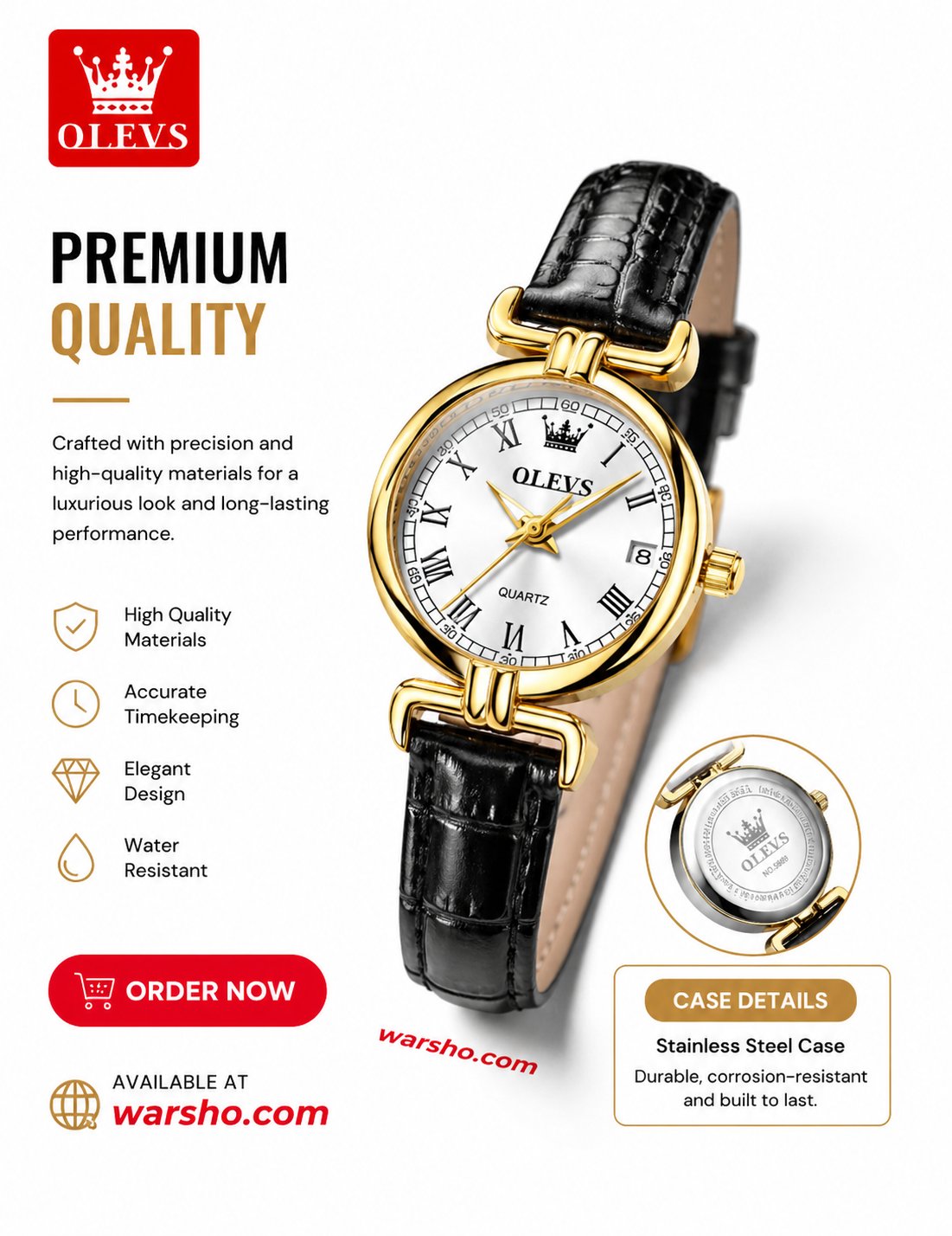 Refine your look with the OLEVS 5645 Women’s Elegant Quartz Watch, designed with a classic and timeless style. Featuring a round dial with Roman numerals and a built-in date display, this watch offers both elegance and everyday functionality.